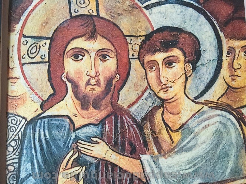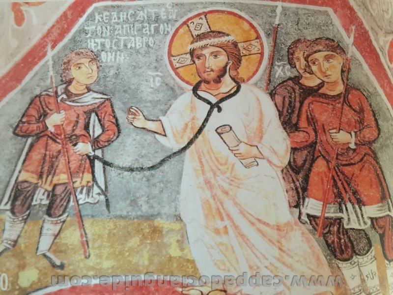 Сцены: напротив входа находится портрет Иисуса, держащего Библию в левой руке. Донор церкви изображен рядом с Иисусом. На восточной стороне склепа находятся Святой Феодор и Елена, держащая истинный крест со своим сыном Константином великим. На западе склепа находится длинношерстный, голый святой Онуфрий за пальмой, а святой Томас в освящающем положении рядом с ним, и св. Василий, держащий книгу. В первом веке нашей эры люди, называющие себя «отшельники», жили в уединении в египетской пустыне. Они посвятили себя религии. В IV веке святой Пафнутий отправился в Египет, чтобы узнать об образе жизни отшельников, и там он встретил Святого Пафнутия, который помог святому Онуфрию, когда он умирал, поскольку он был лучшим примером нравственных ценностей и самоконтроля. Святой Онфриос изображен голым, длинноволосым и широким сундуком, перед ним стоит пальма.